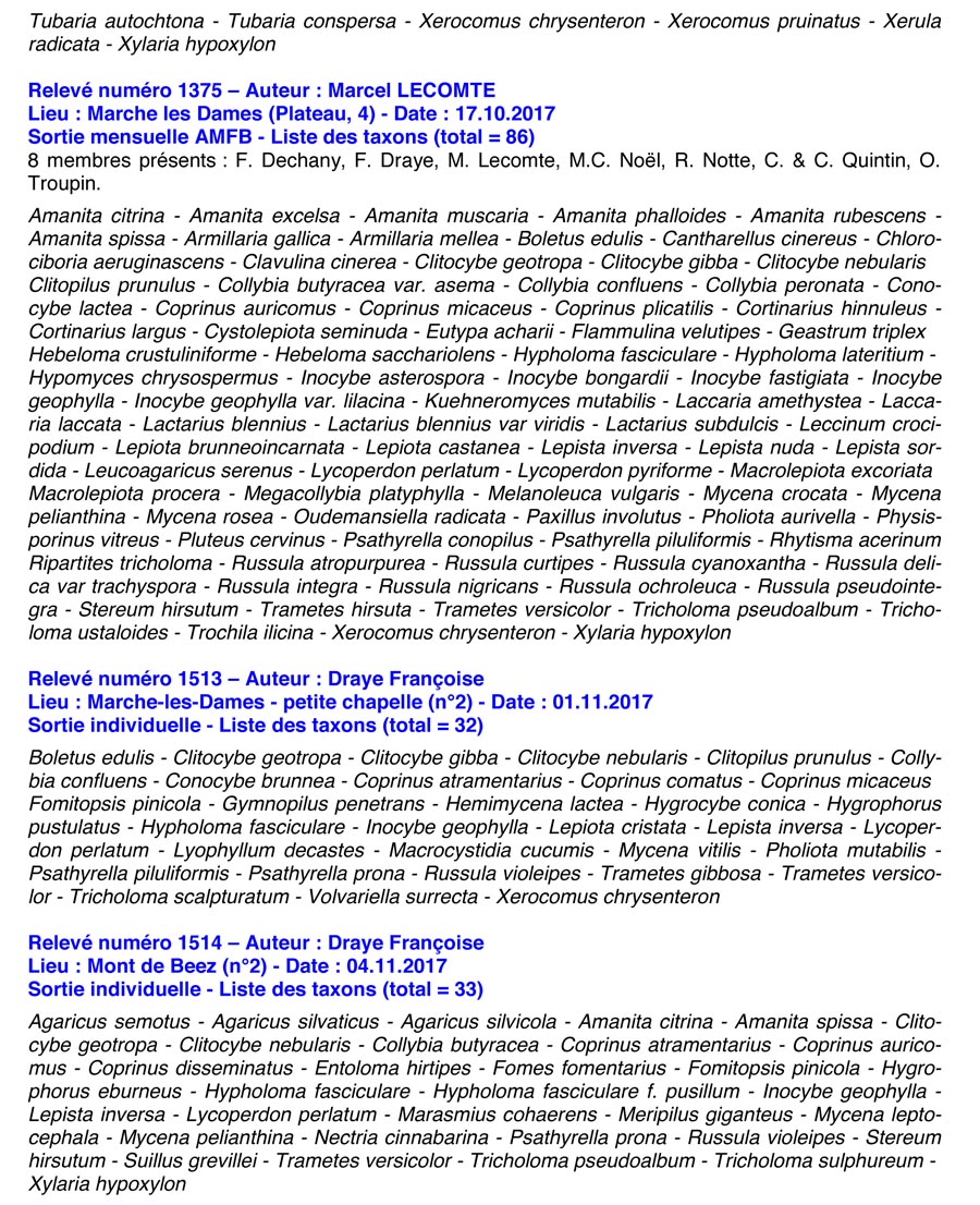 Liste des différentes récoltes, de 2017, réalisées sur le site, et encodées avec Mycobel.