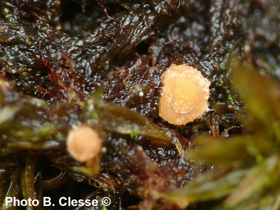 À la base de tiges de la mousse Orthotrichum affine, sur tronc de sureau (Sambucus sp.).