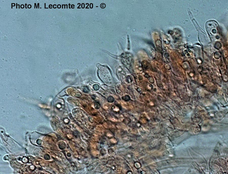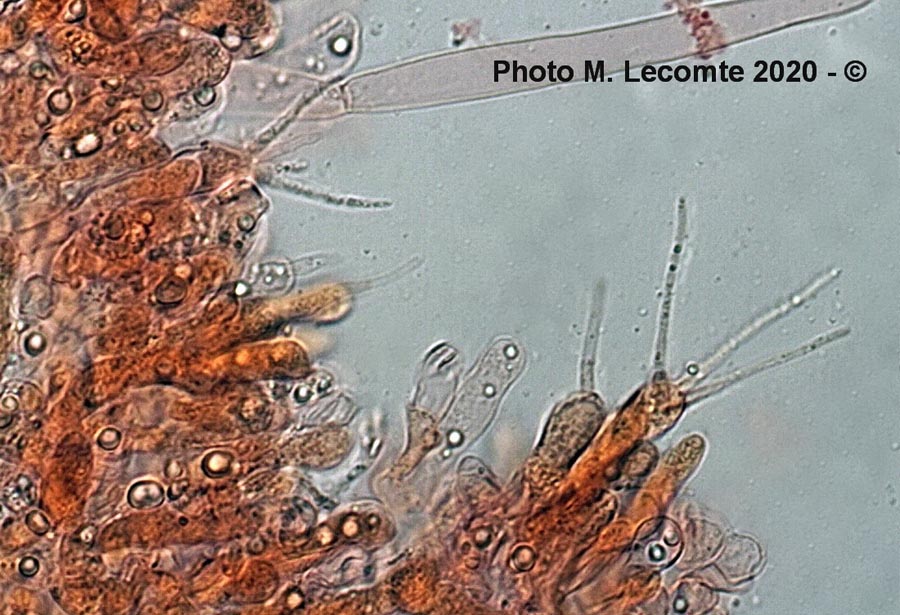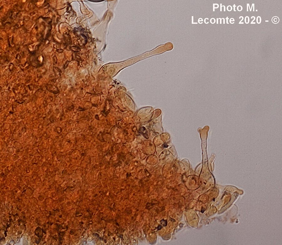 Le biotope était assez curieux, puisque ces champignons poussaient sur une poutre en chêne, couverte de mousse, fixée contre un quai vertical en pierres, sur la Meuse, afin d’empêche la coque des bateaux de battre contre la pierre. Une microscopie de routine permet de mettre en évidence des caractères tout-à-fait insolites et surprenants : cystides fourchues, basides 1-, 2- et 3-sporiques munies de stérigmates anormalement longs (voir les photos ci-après).