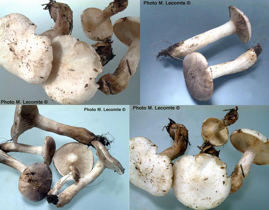 d) chapeau : diamètre 6 cm, convexe, évoquant par son aspect charnu et sa couleur un tricholome du groupe Tricholoma terreum, gris noirâtre à la récolte mais devant nettement brunâtre en vieillissant, finement squamuleux (plus fortement au disque qui était ici crevassé-craquelé), à marge incurvée finement cannelée
