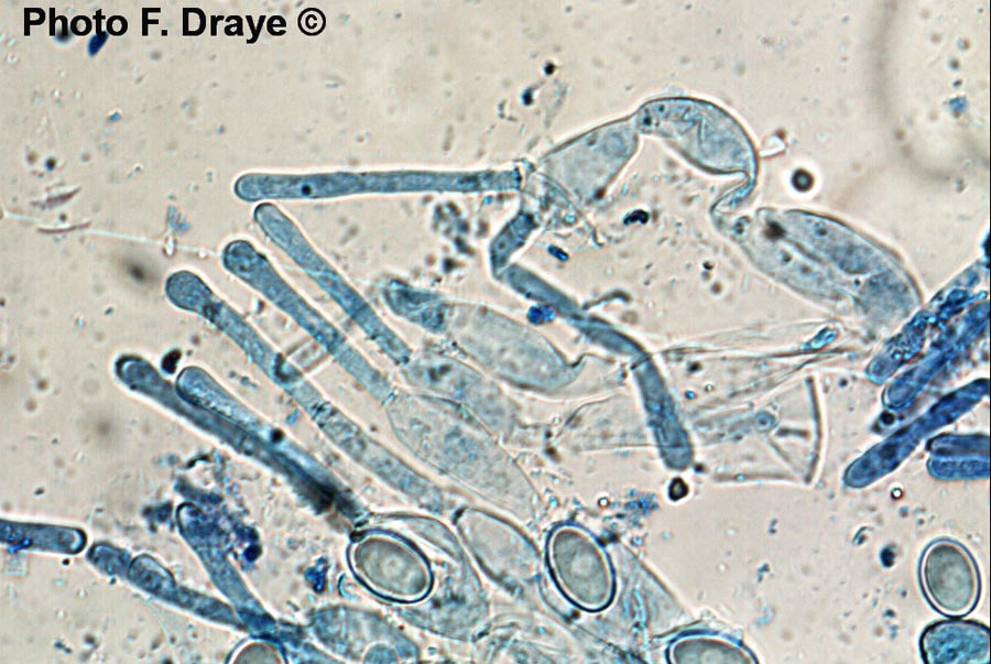 Peziza domiciliana (F. Draye) (asques - spores - champignon - fiche synthèse - micro électronique)