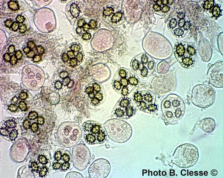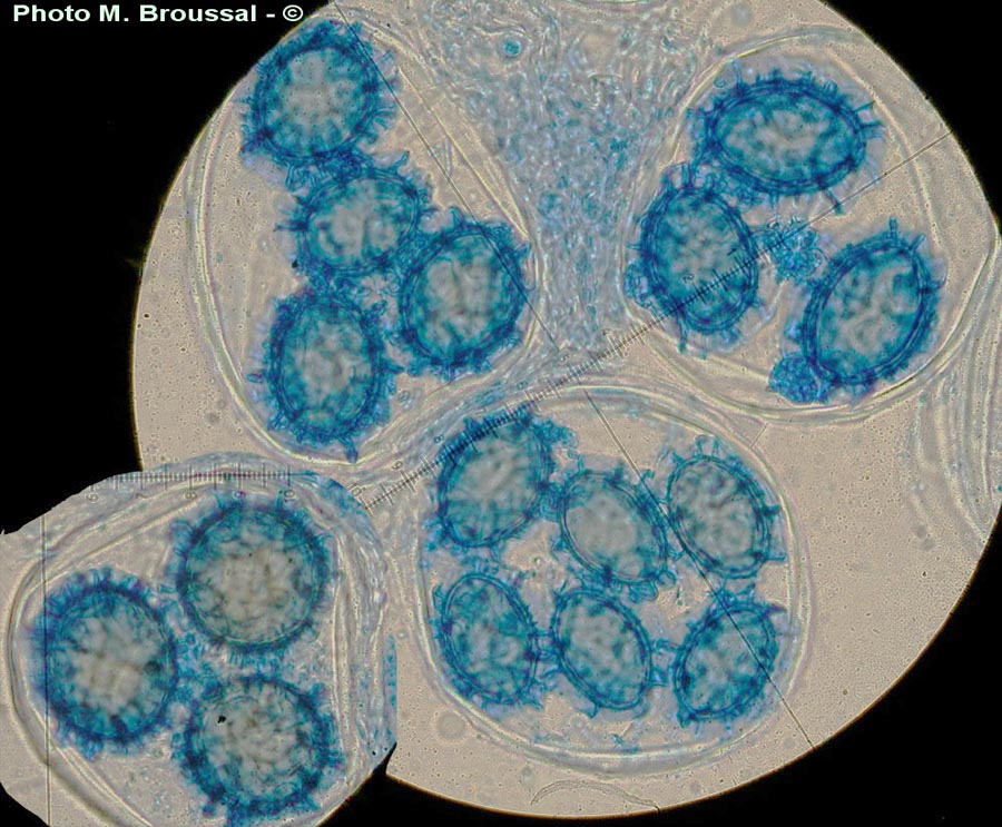 Myco-microscopie : ascospores. Tuber uncinatum Tuber uncinatum est une truffe, c’est-à-dire un champignon hypogé (qui vit dans le sol). Elle est communément appelée truffe de Bourgogne ; des auteurs italiens la synonymisent avec Tuber aestivum (truffe d’été). Cette espèce est nettement plus nordique que T. melanosporum, et est fréquente en Bourgogne et en Champagne. Son odeur et sa saveur sont très agréables, peu différentes finalement de la truffe du Périgord. Elle est de plus en plus cultivée, et on trouve facilement des pieds de noisetier mycorhisés avec cette espèce, qui pousse même en Belgique. Les spores sont ornées d’épines +/- courtes, terminées par un crochet caractéristique, une sorte d’hameçon.