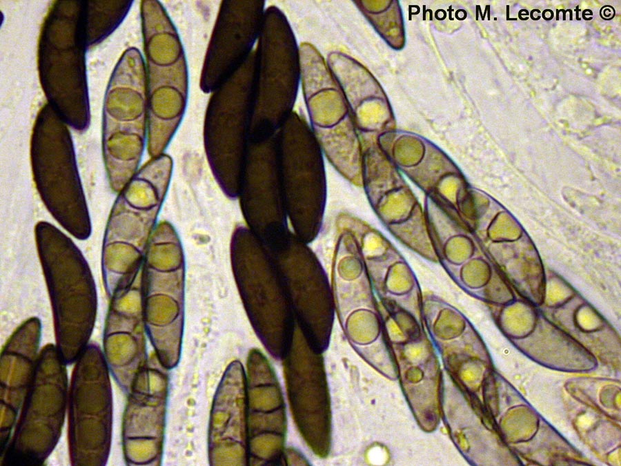 Myco-microscopie : ascospores. Xylaria polymorpha Une coupe dans le sporophore montre un stroma fibreux, blanc à blanchâtre ; si on y regarde de plus près, on voit une couche superficielle de périthèces dans lesquelles on va trouver les ascospores.
