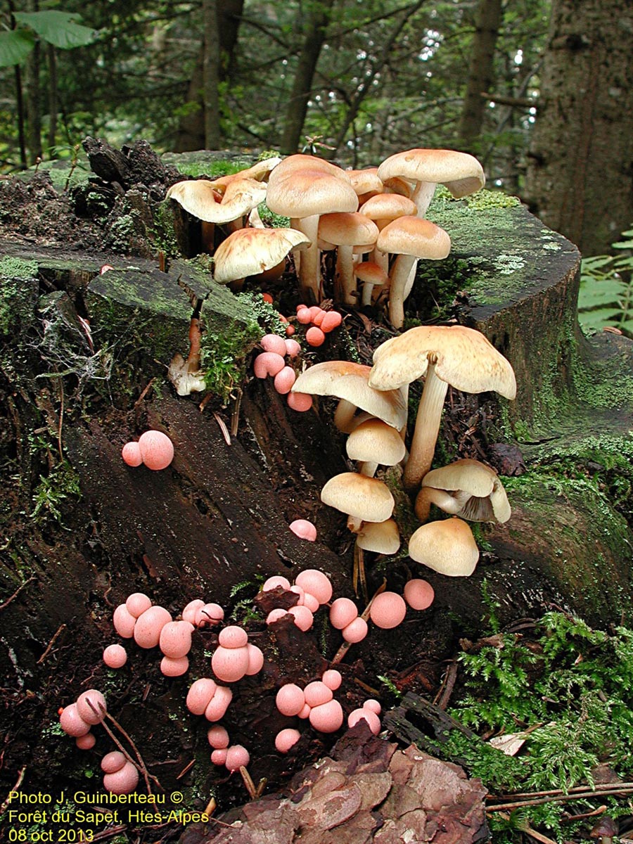 Ils contribuent, avec nombre d’autres espèces, à dégrader les souches : Lycogala epidendron et Hypholoma sp. (J. Guinberteau)