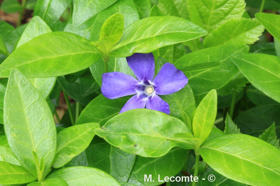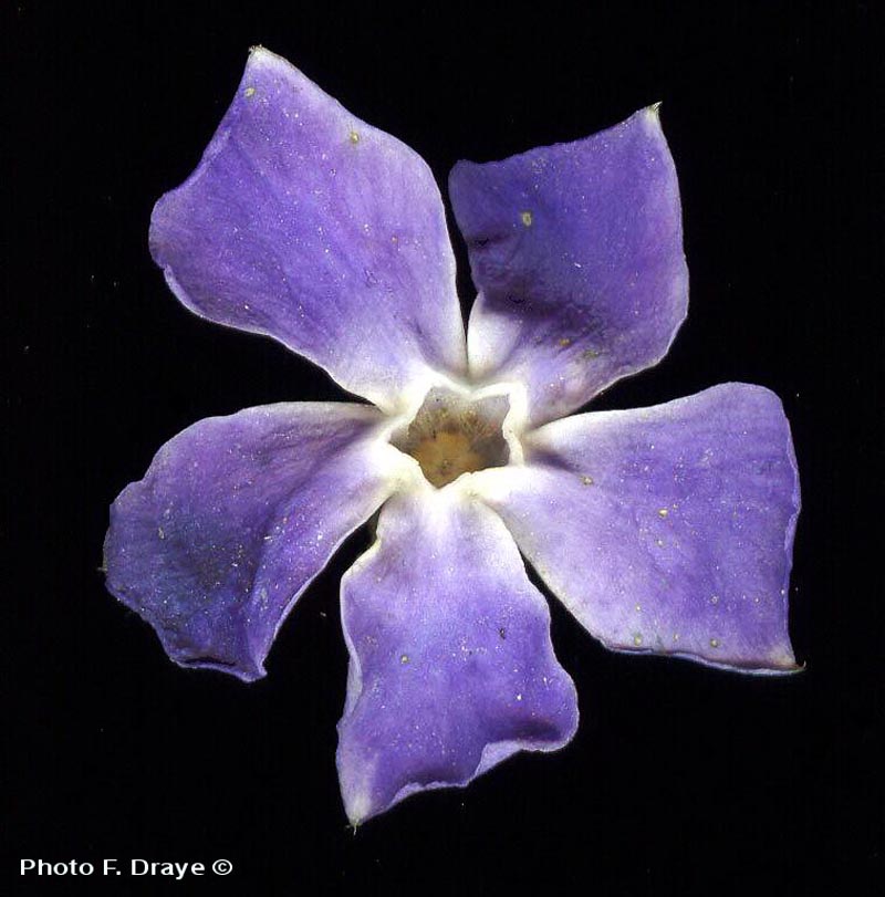 Botanique. Vinca minor La petite pervenche, famille des Apocynaceae, fleurit de mars à avril (éventuellement mai) avec parfois une refloraison automnale. Elle apprécie les sols à humus doux des bois, haies... Elle est mellifère. Sa couleur bleu violacé est très attarctive pour les abeilles. Le nectar est fabriqué par deux nectaires situé au fond du tube de la corolle, de chaque côté de l'ovaire. La petite pervenche est très appréciée comme couvre-sol et demande peu de soins. |