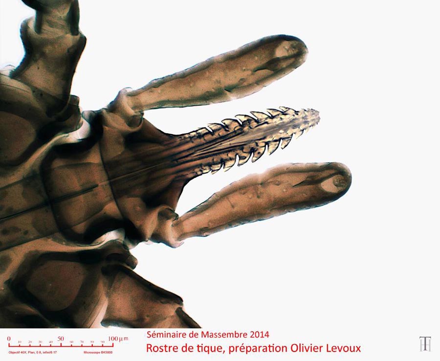 Tiques. Ixodes ricinus - Tique du mouton Notamment une photo de l’hypostome de la tique qui lui permet de s’ancrer dans la peau de son hôte ; sa forme dentelée inverse explique la difficulté de s’en débarrasser. Elle est appelée tique du mouton et parfois, par erreur, tique du chien (Rhipicephalus sanguineus) (*) Les borrélies sont des bactéries spiralées, du groupe des Spirochètes. La première photo représente un mâle (ceux-ci ne se nourrissent pas, comme toutes les tiques mâles, ils ne sont là que pour la reproduction). Cette tique est très commune presque partout en France et pays limitrophes, la plus fréquente sur les chiens, l'homme et grands gibiers.