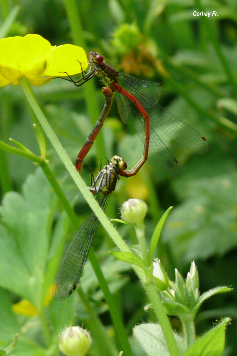 Entomologie. Accouplement de Pyrrhosoma nymphula Les Odonates sont divisés en deux sous-ordres : les Zygoptères (demoiselles ; insectes délicats au corps fin, au repos, les ailes (de tailles égales) sont verticales au dessus du corps) et les Anisoptères (libellules ; beaucoup plus grands et plus massifs que les demoiselles, les ailes postérieures sont plus larges que les ailes antérieures, au repos ; elles sont maintenues horizontalement). Chez les Zygoptères (demoiselles), les appendices du mâle (au bout de l'abdomen) s'accrochent au dessus du protothorax des femelles. Si la femelle accepte l'accouplement, elle recourbe son abdomen ; le mâle la ramène sous lui et ancre les organes copulateurs de la femelle à son appareil copulateur. L'accouplement dessine une figure en forme de coeur (coeur copulatoire). Ici : petite nymphe au corps de feu (photo). |