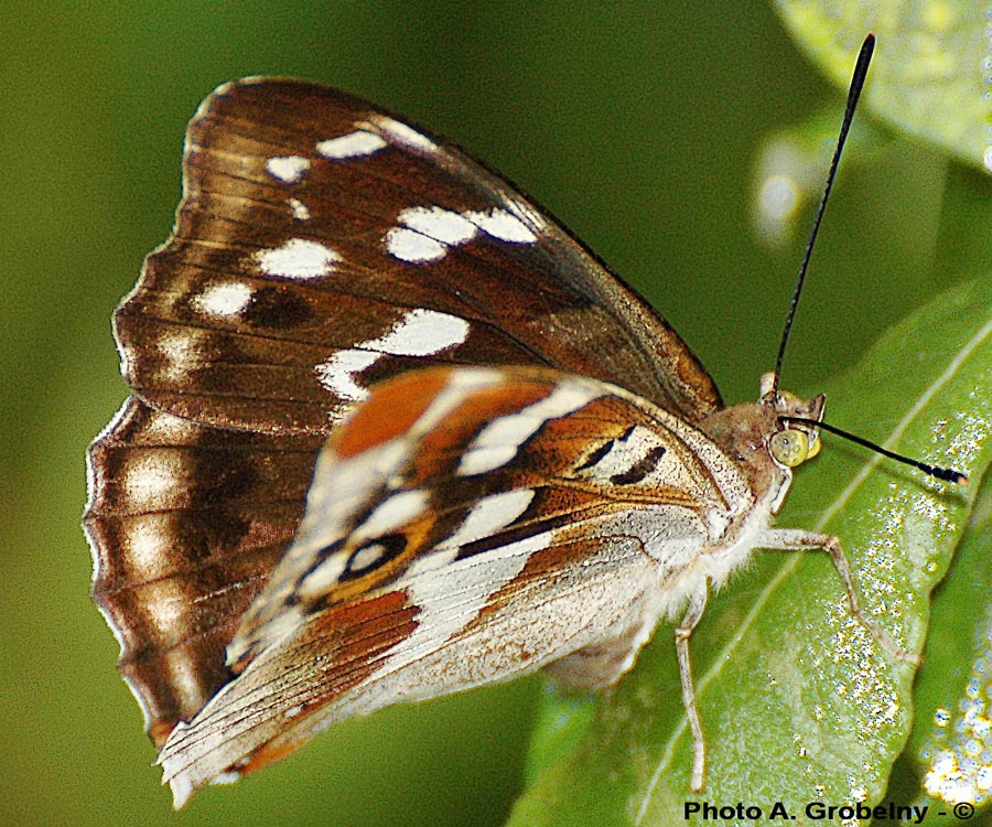 Entomologie. Apatura iris Il s’agit ici d’une femelle d'un Rhopalocère, le grand mars changeant, difficile à observer car elle fréquente très souvent la cime des arbres, sauf si on parvient à l’attirer au sol avec des fruits trop mûrs, ou du fromage très odorant. |