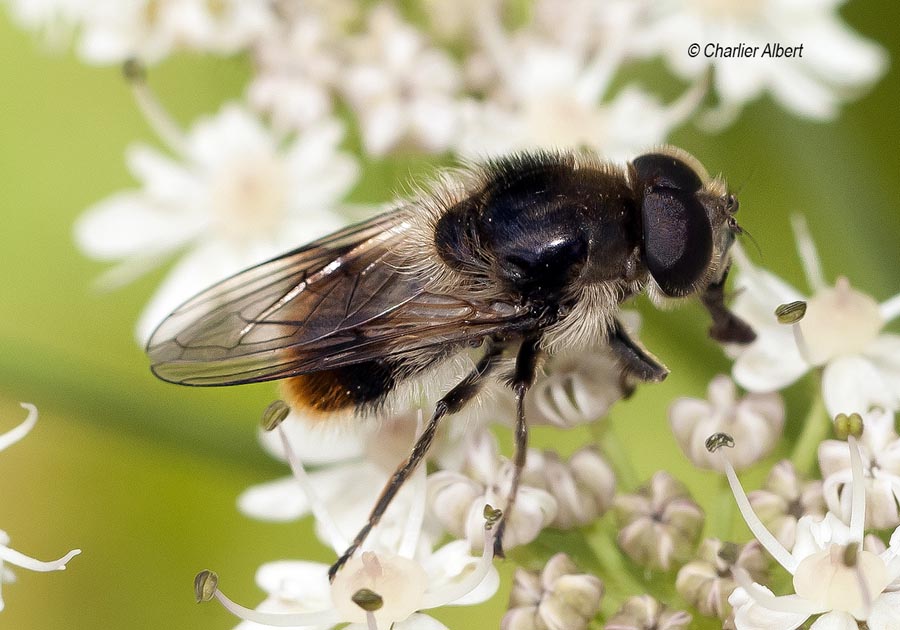 Diptera – Syrphidae – Cheilosie illustrée : petit syrphe qui rappelle vaguement un bourdon. Butine régulièrement sur les ombellifères (Heracleum).