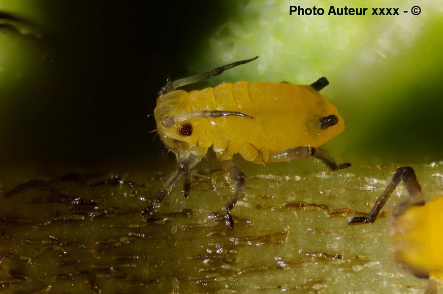 Un puceron adulte et une forme larvaire (ils ont des métamorphoses incomplètes, et la larve est donc déjà un petit puceron ne miniature).