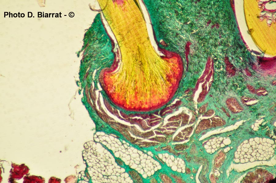 Coupes dans le bulbe de poils de hérisson (Erinaceus europaeus) (D. Biarrat)