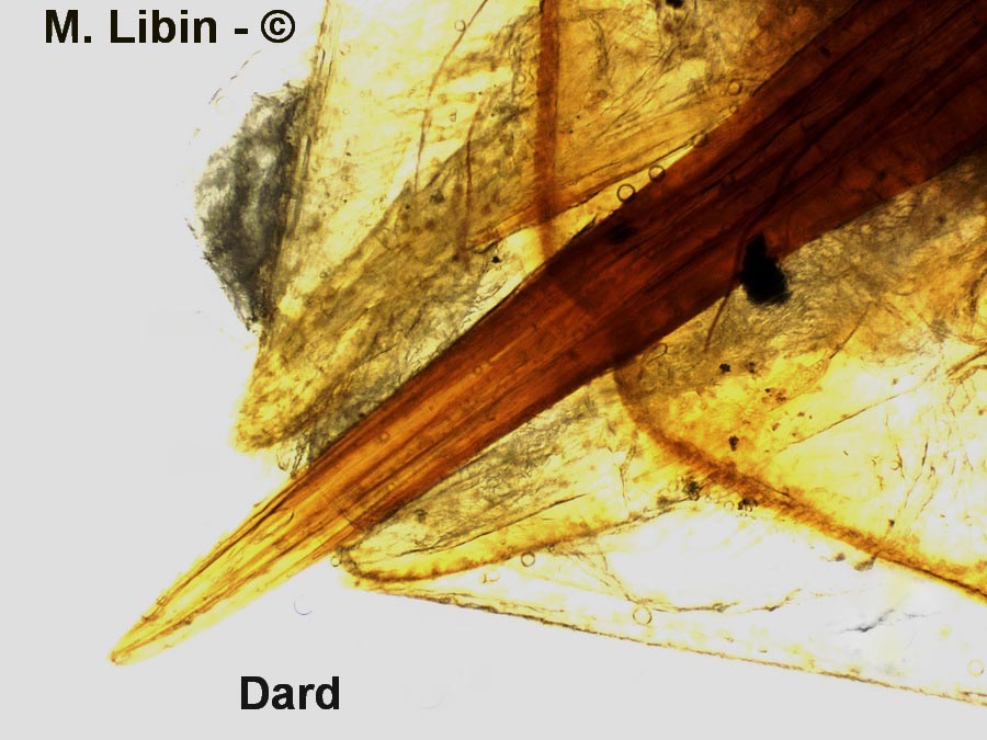 Société Wallonne de Microscopie (SWM). Images - invertébrés. Guêpe (Vespula vulgaris) (dard) Le dard de la guêpe est lisse, ce qui lui permet de piquer à de nombreuses reprises, contrairement à l’abeille où le dard est en forme de harpon qui reste dans la peau et est arraché de l’abdomen lorsque l’abeille s’envole, et cela est létal pour elle (cela explique qu’elle l’utilise uniquement pour se défendre ou pour protéger la ruche). |